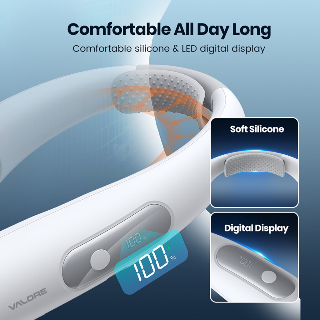 Designed with soft, skin-friendly silicone, this neck fan rests gently for all-day comfort.